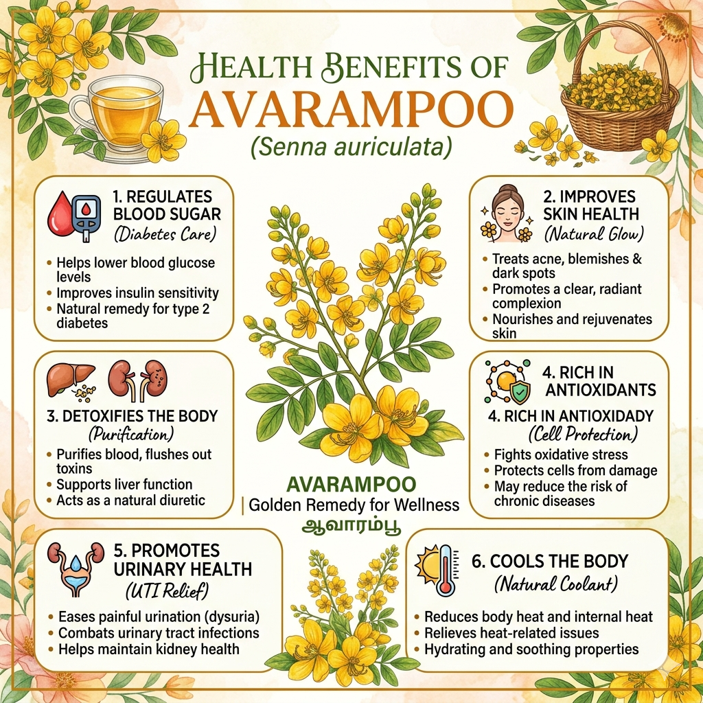 • Metabolic & Blood Sugar Support: Avarampoo is widely used to maintain healthy glucose levels and improve insulin sensitivity.