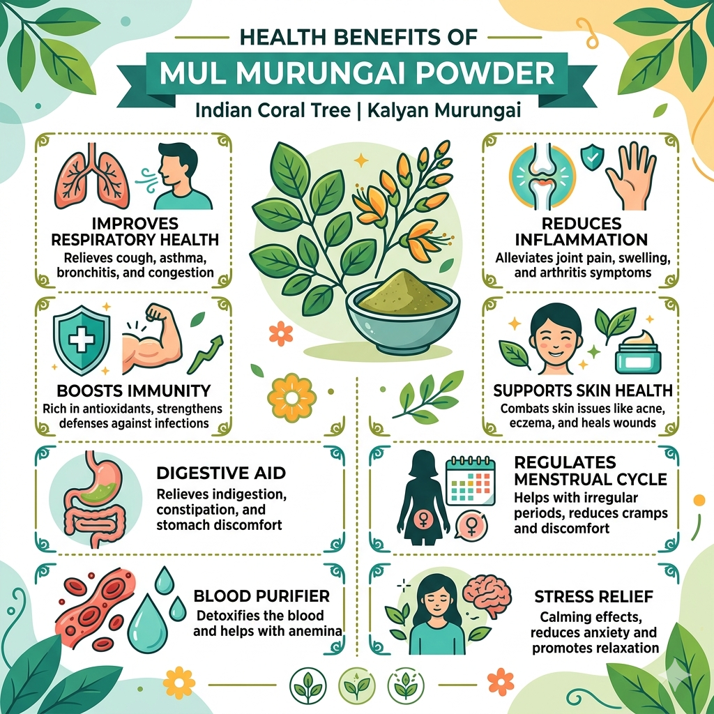 Mul Murungai (meaning “thorns on moringa-like tree”) is highly regarded in South Indian traditions as a “multivitamin green”. The powder is created by cleaning, drying, and finely grinding the heart-shaped leaves of the Erythrina variegata tree.